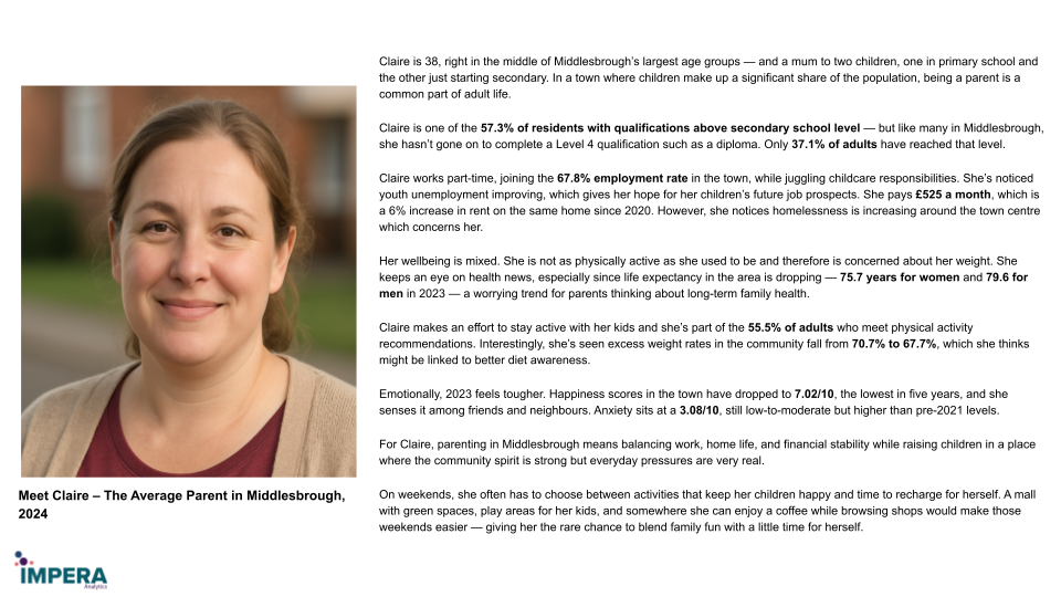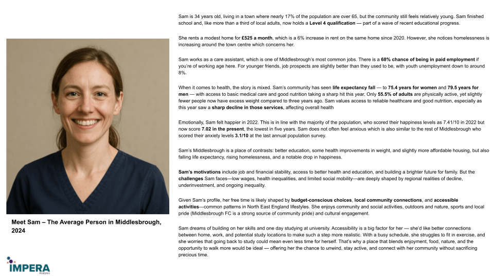 This section showcases how Place Insight data has been used to create personas for Middlesbrough. The personas are not intended as definitive representations of residents, but as illustrative examples of the kinds of insights Place Insight can generate when local data is translated into clear, human-centred stories.
